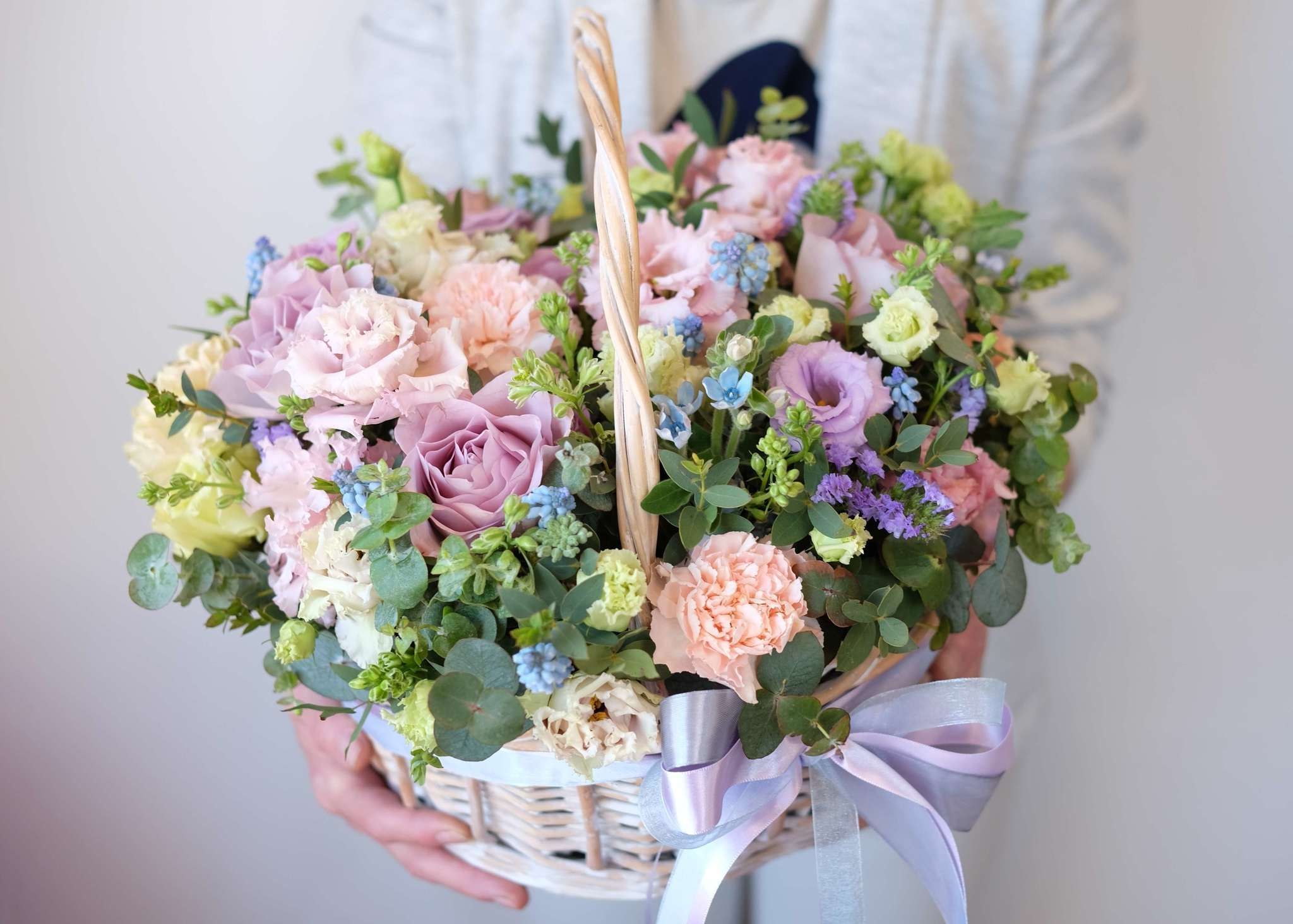Корзина собрана плотно, каждый цветок находит своё место в общей композиции.