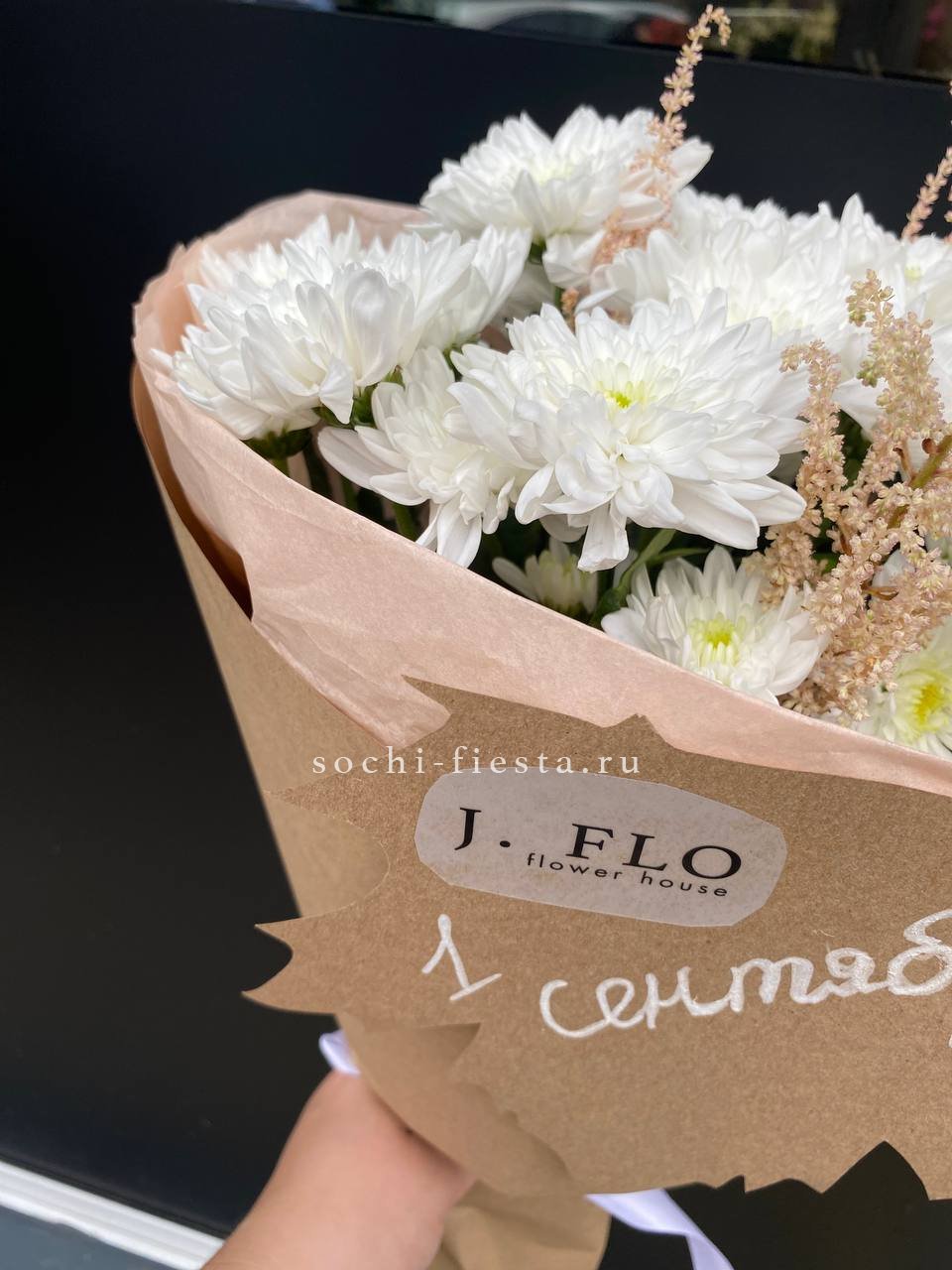 Белоснежные шапки хризантем и воздушные метелки астильбы собраны в композицию с четким вертикальным ритмом. Букет напоминает о первых школьных линейках и свежести сентябрьского утра.