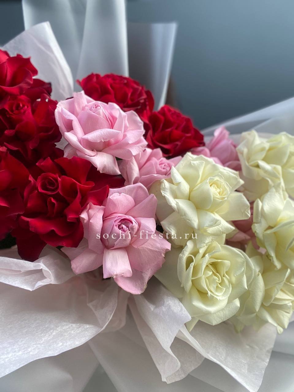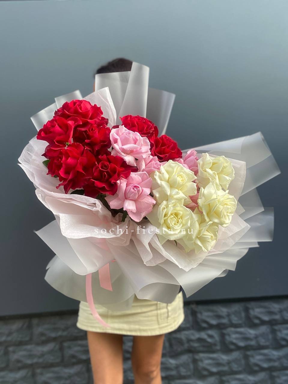 Сорок пять бутонов формируют пышную композицию с заметным присутствием в любом пространстве. Красные и белые розы раскрываются постепенно, сохраняя свежесть несколько дней.