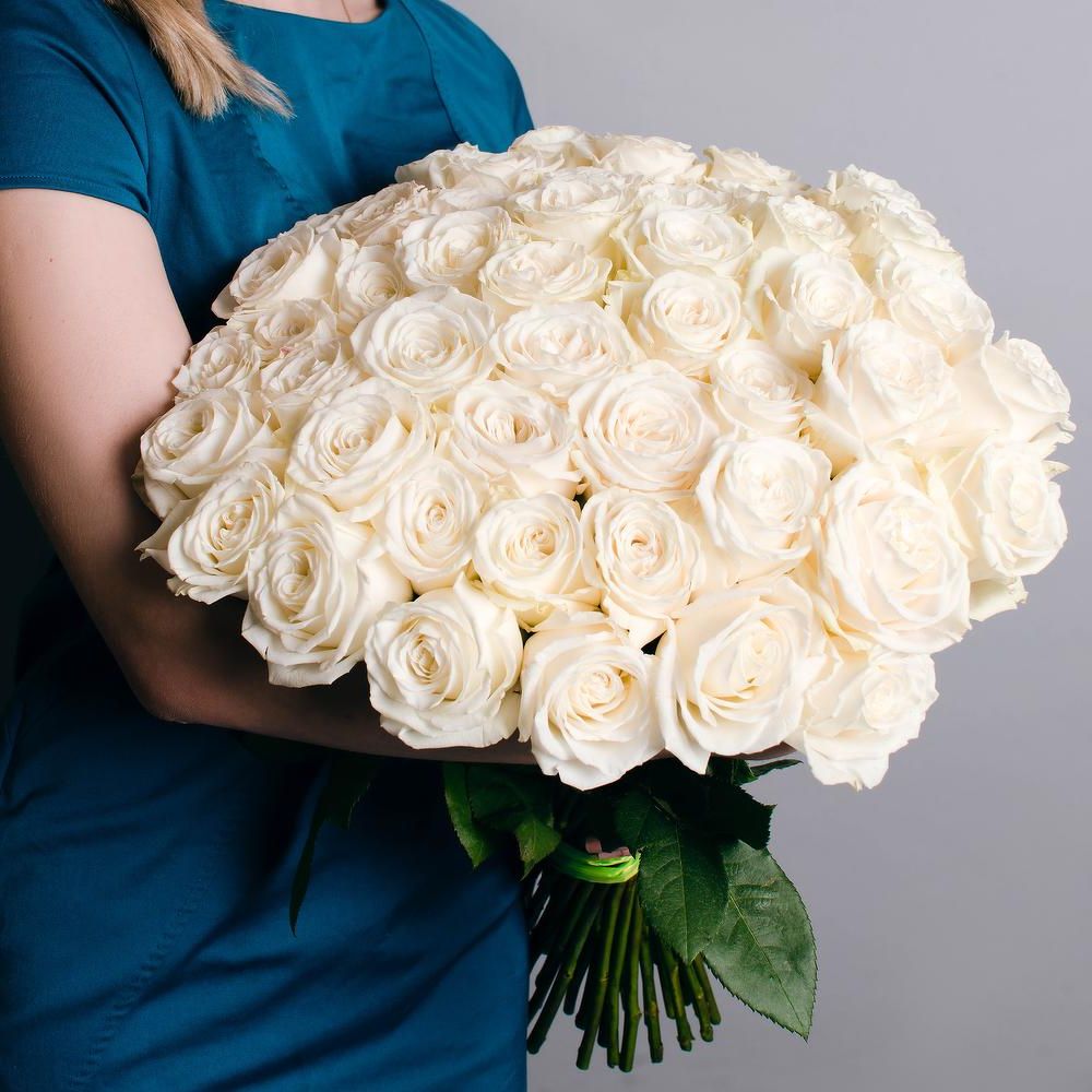 Пятьдесят один бутон выстраиваются в объёмную сферу с чёткой геометрией. Белые розы держат форму и создают ощутимое визуальное присутствие. Букет занимает пространство уверенно и спокойно.