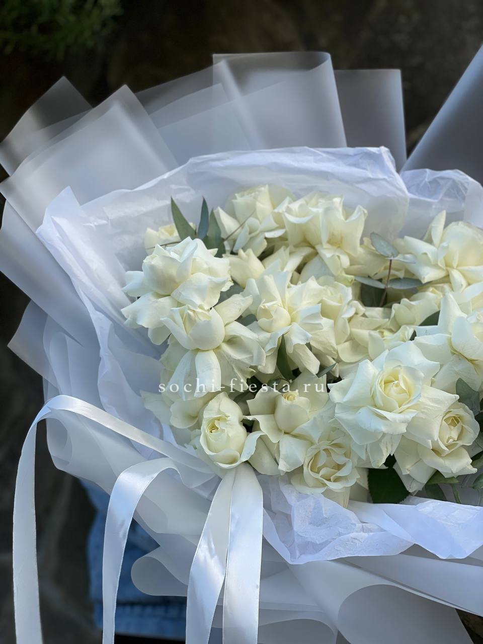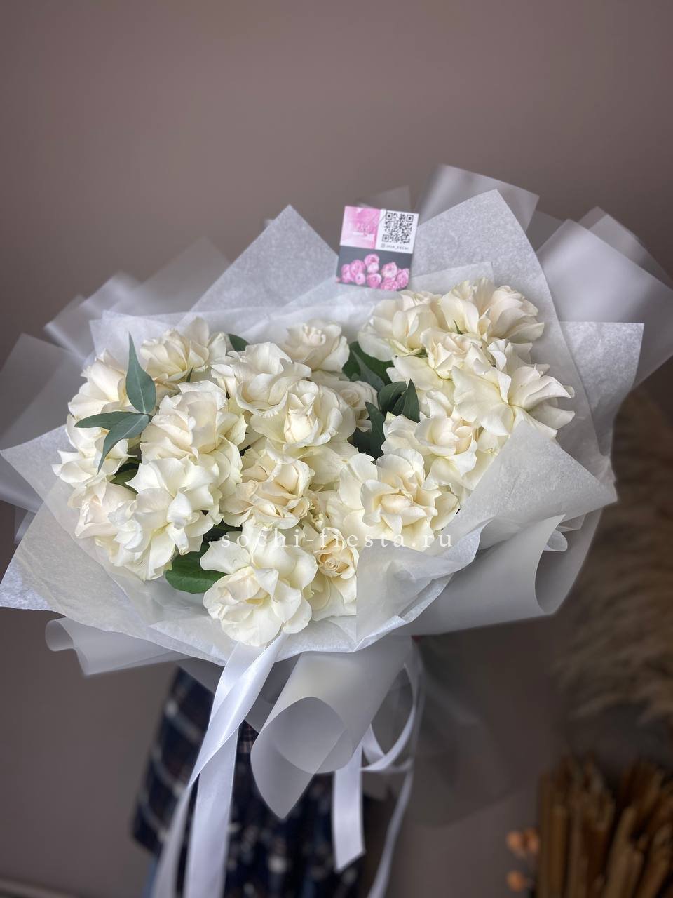 Семь роз сорта Иммерсив в лаконичной дизайнерской подаче. Чистый белый цвет и графичная форма создают спокойное, почти медитативное впечатление. Для тех, кто предпочитает точность.