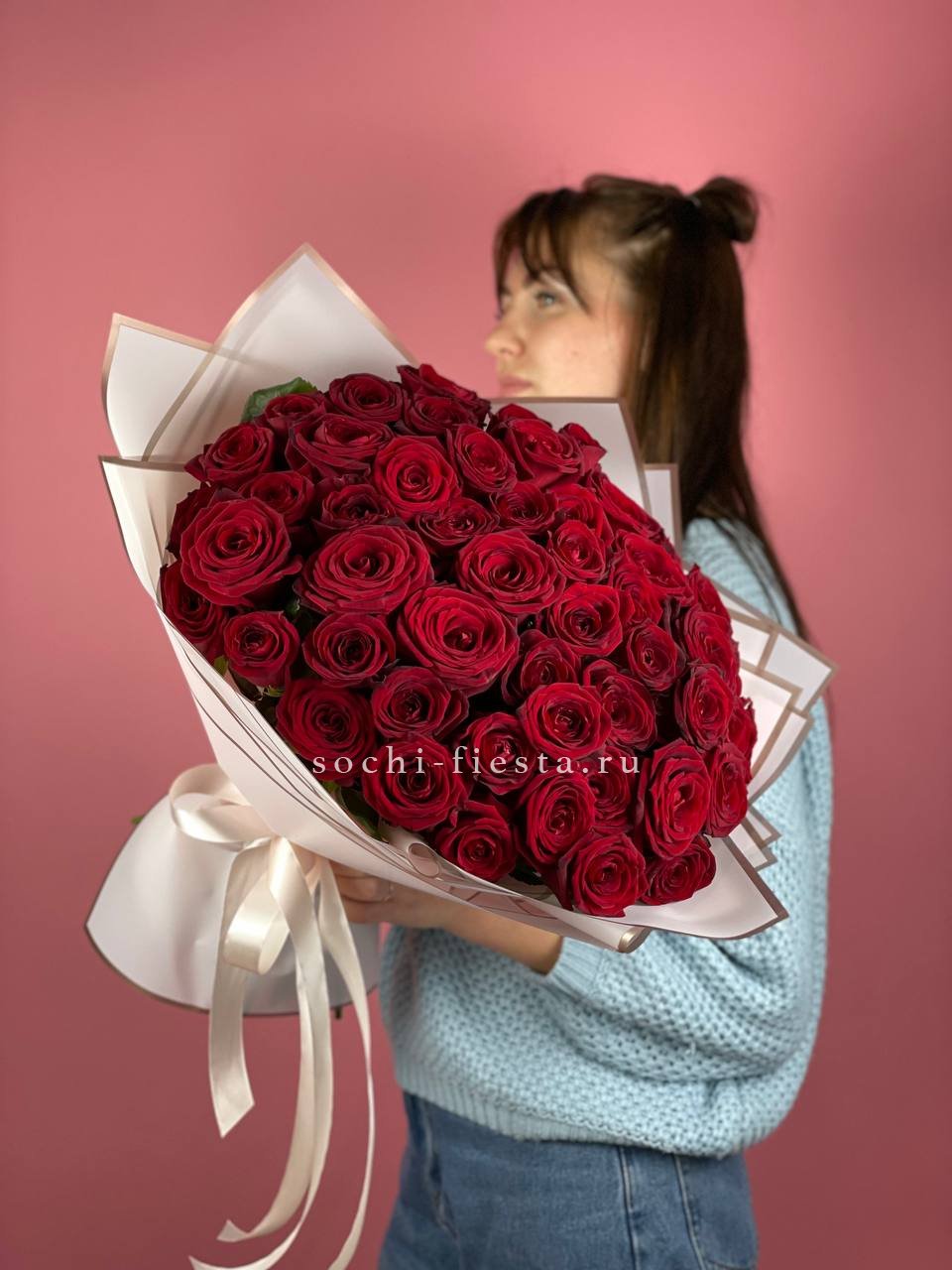51 роза, лента, дизайнерская пленка.
