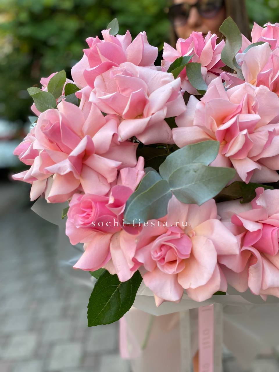 Семнадцать вывернутых роз открывают фактурную глубину лепестков и создают объемную композицию. Каждый бутон раскрывается по-своему, а эвкалипт добавляет воздушности общей форме.