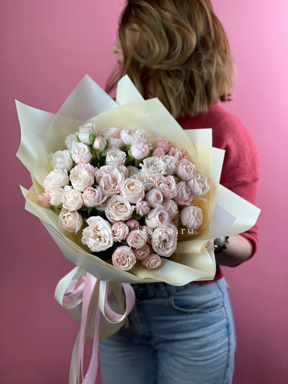 кустовые розы, лента, дизайнерская упаковка.