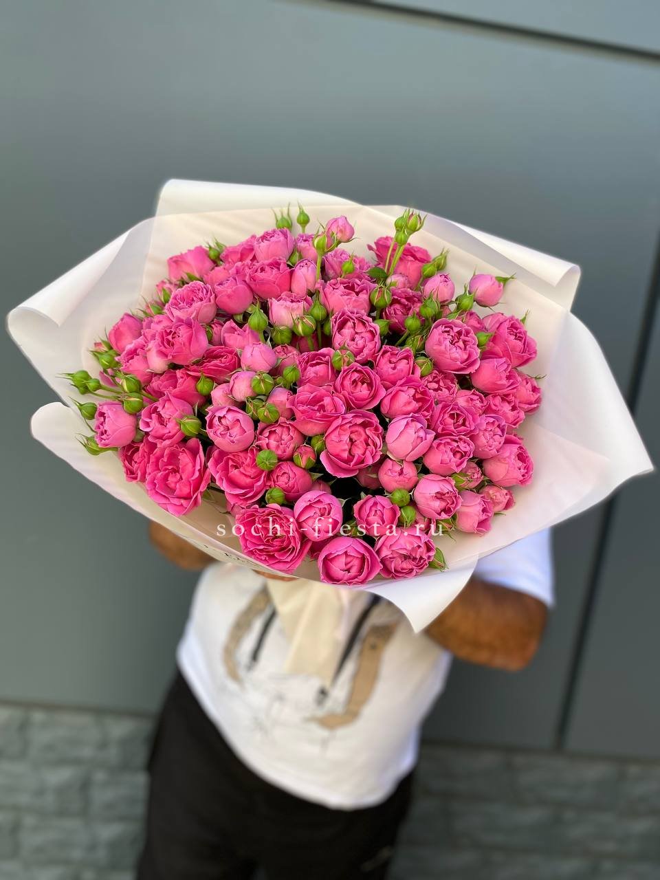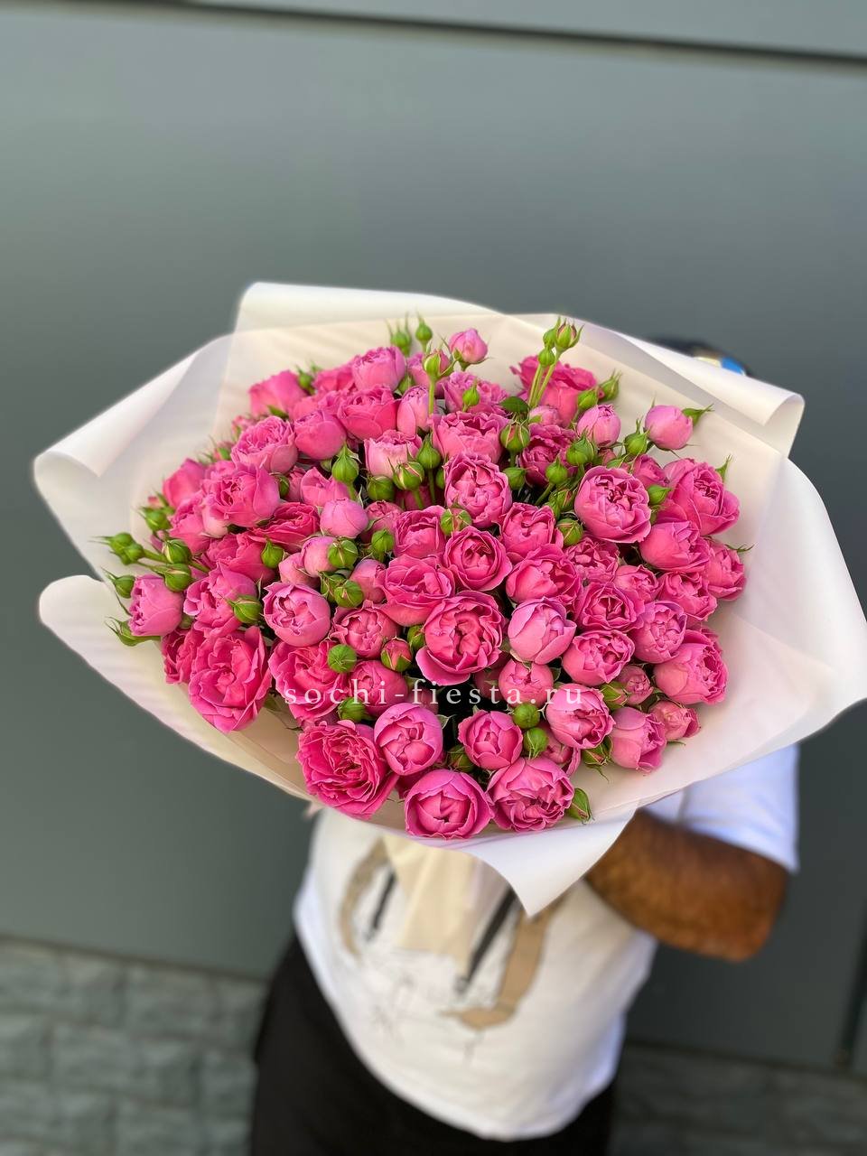 Минимальный состав: 35 пионовидных кустовых роз Мисти бабблс, лента, авторское оформление.