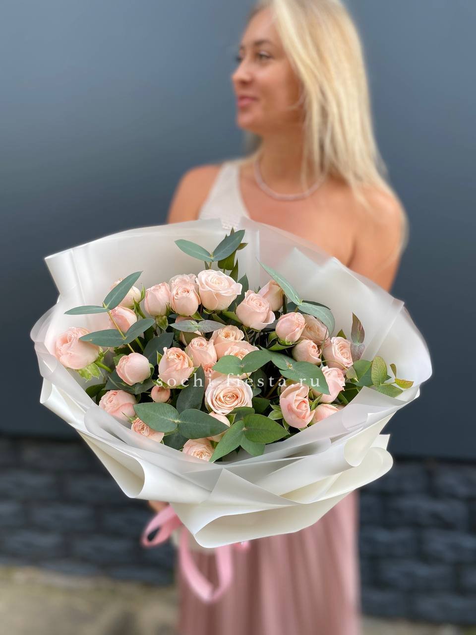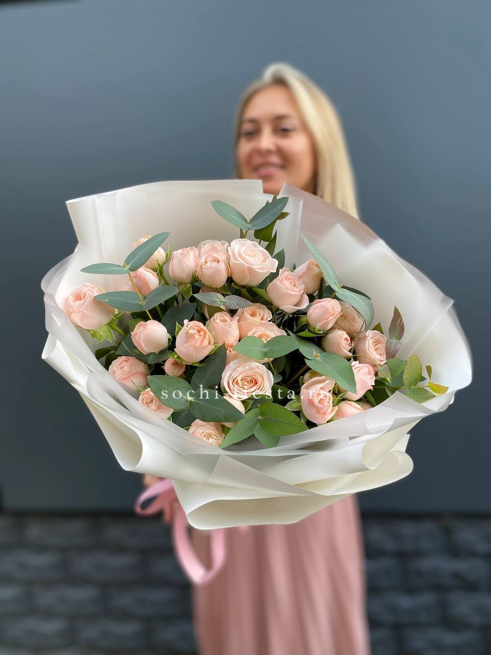 минимальный состав: 9 лавандовых пионовидных кустовых роз, лента, упаковка на выбор.