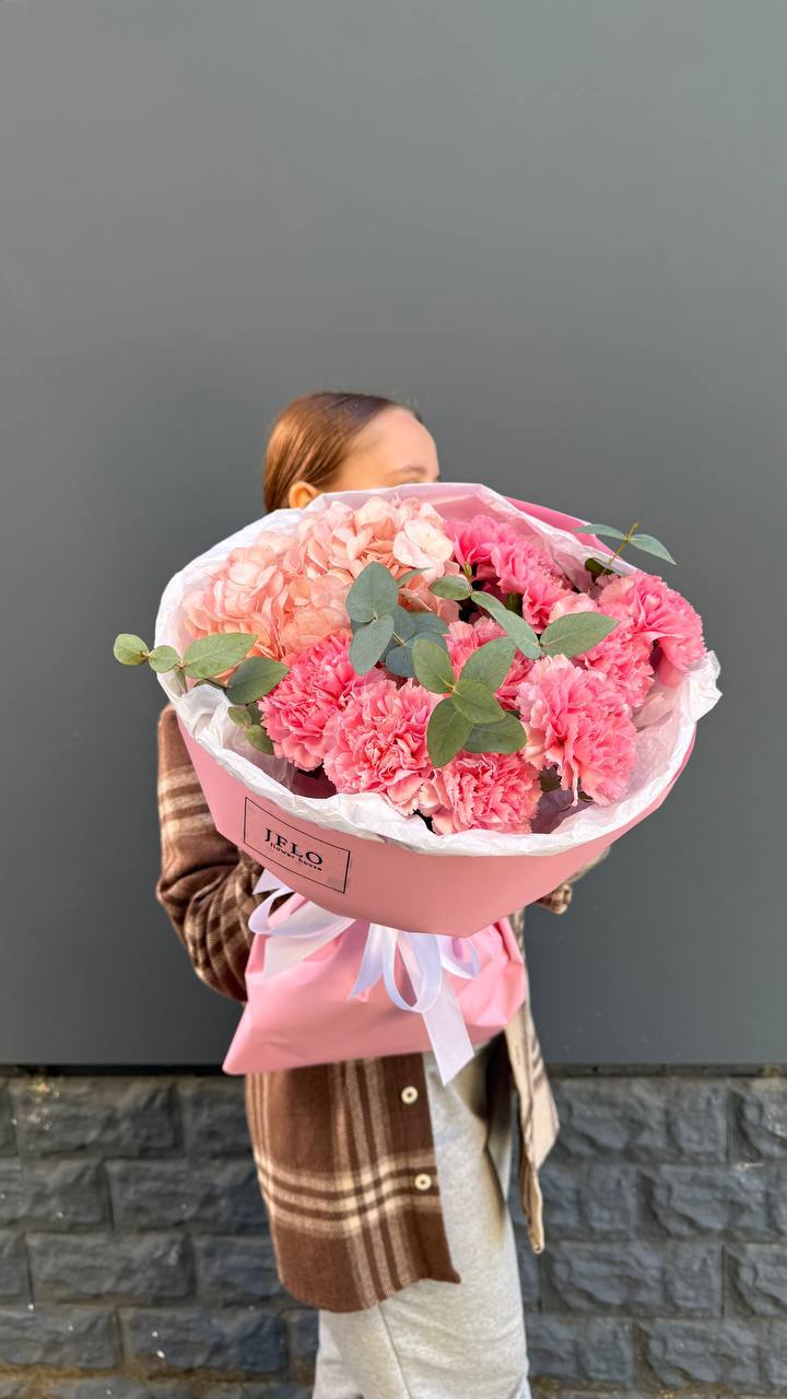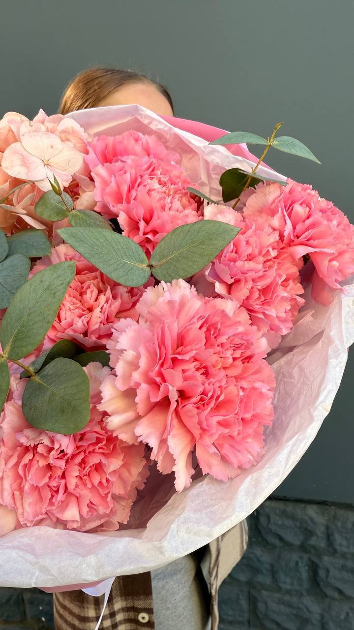 гортензия, розовые розы, диантусы, эустома, маттиолы, эвкалипт лента и дизайнерская пленка.