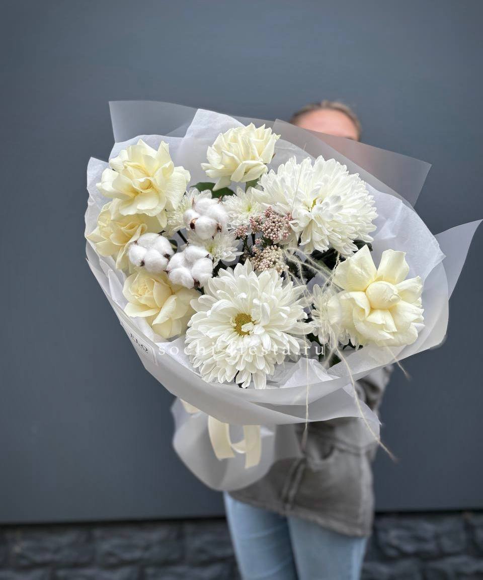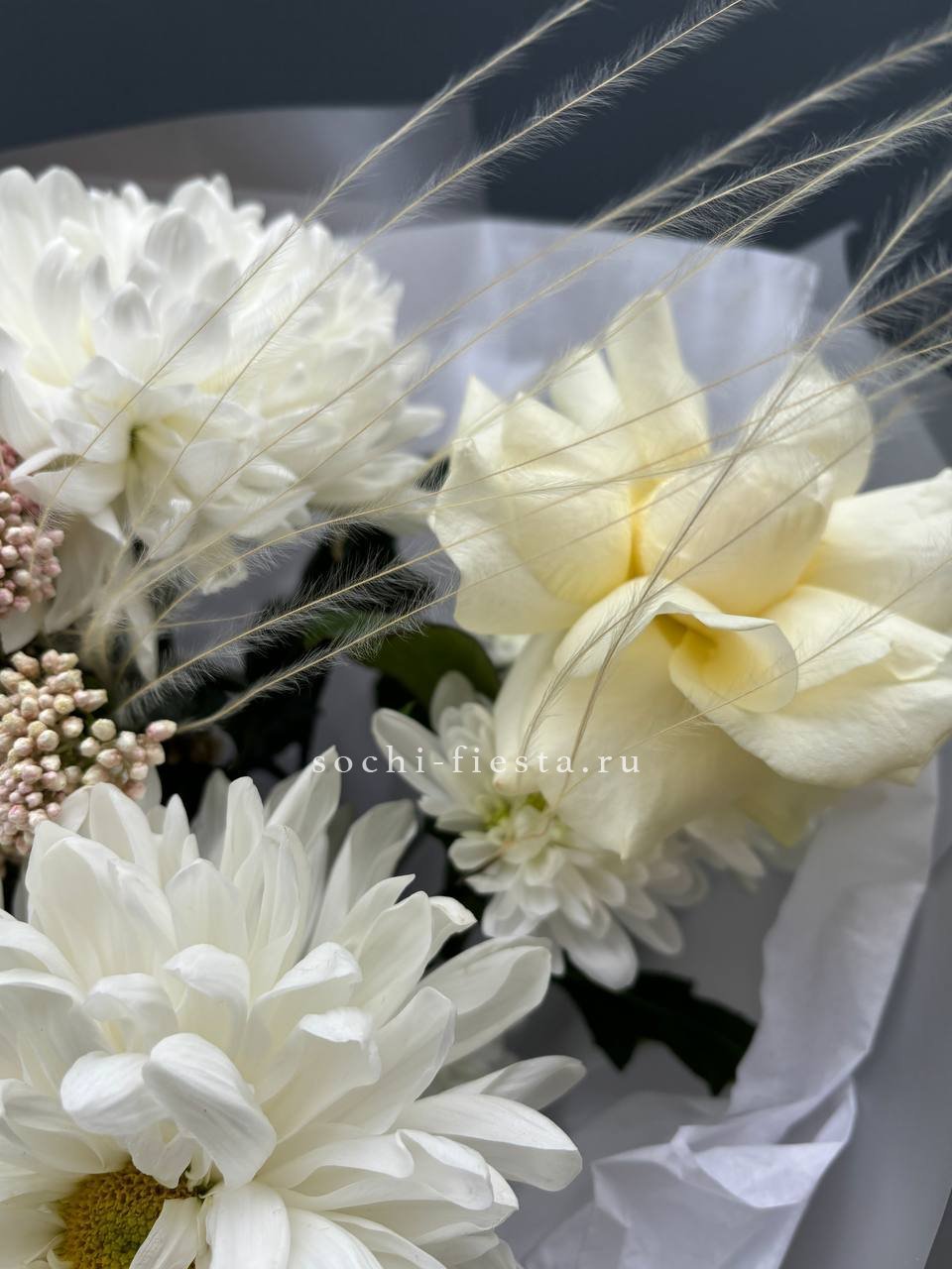 Белоснежные розы собраны в плотный круг и дополнены воздушными соцветиями кустовой хризантемы. Эвкалипт добавляет свежести и завершает композицию мягкими серебристыми оттенками. Букет держит форму и долго сохраняет безупречный вид.