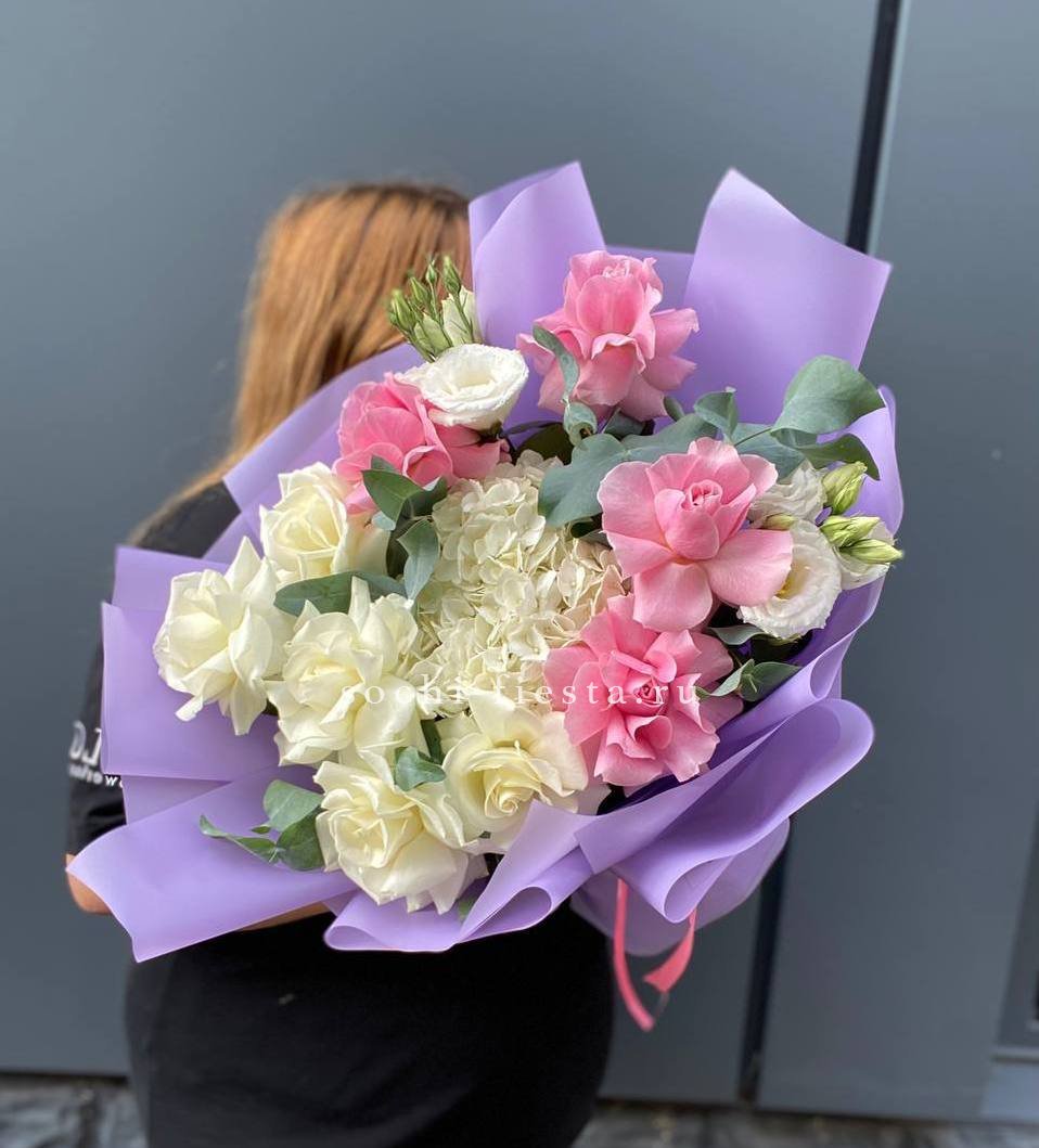 французские розы, маттиола, гортензии, эвкалипт, стифа, упаковка, лента.