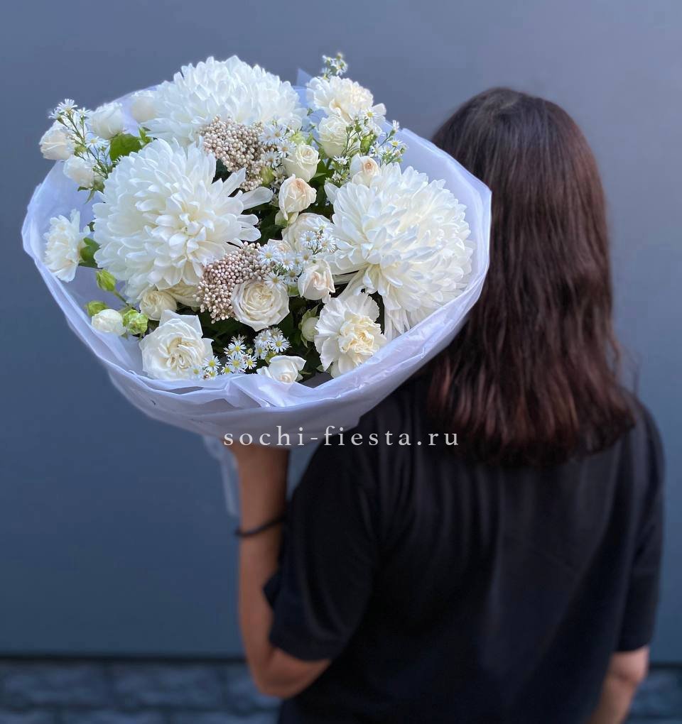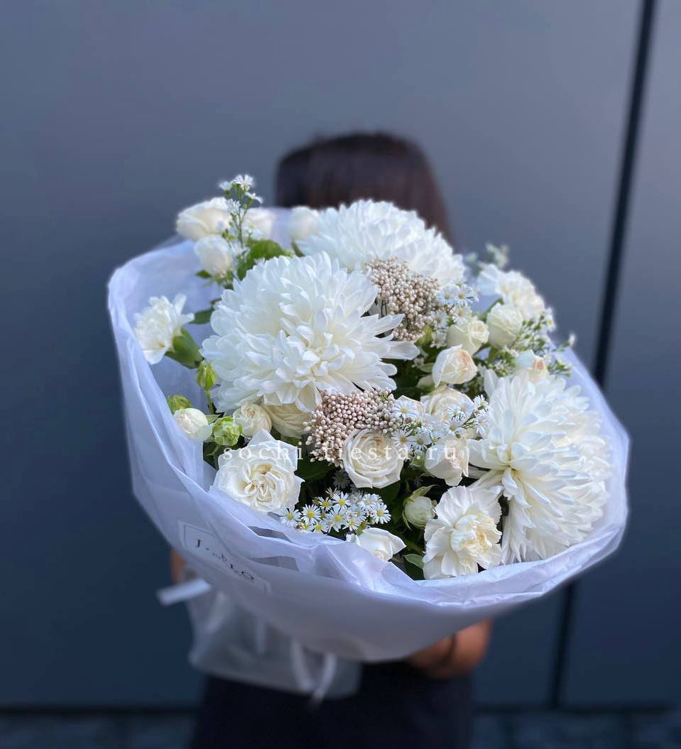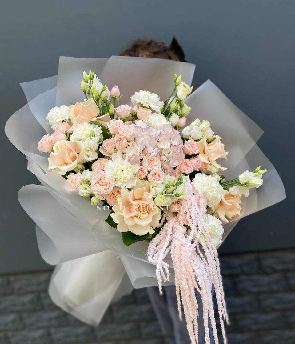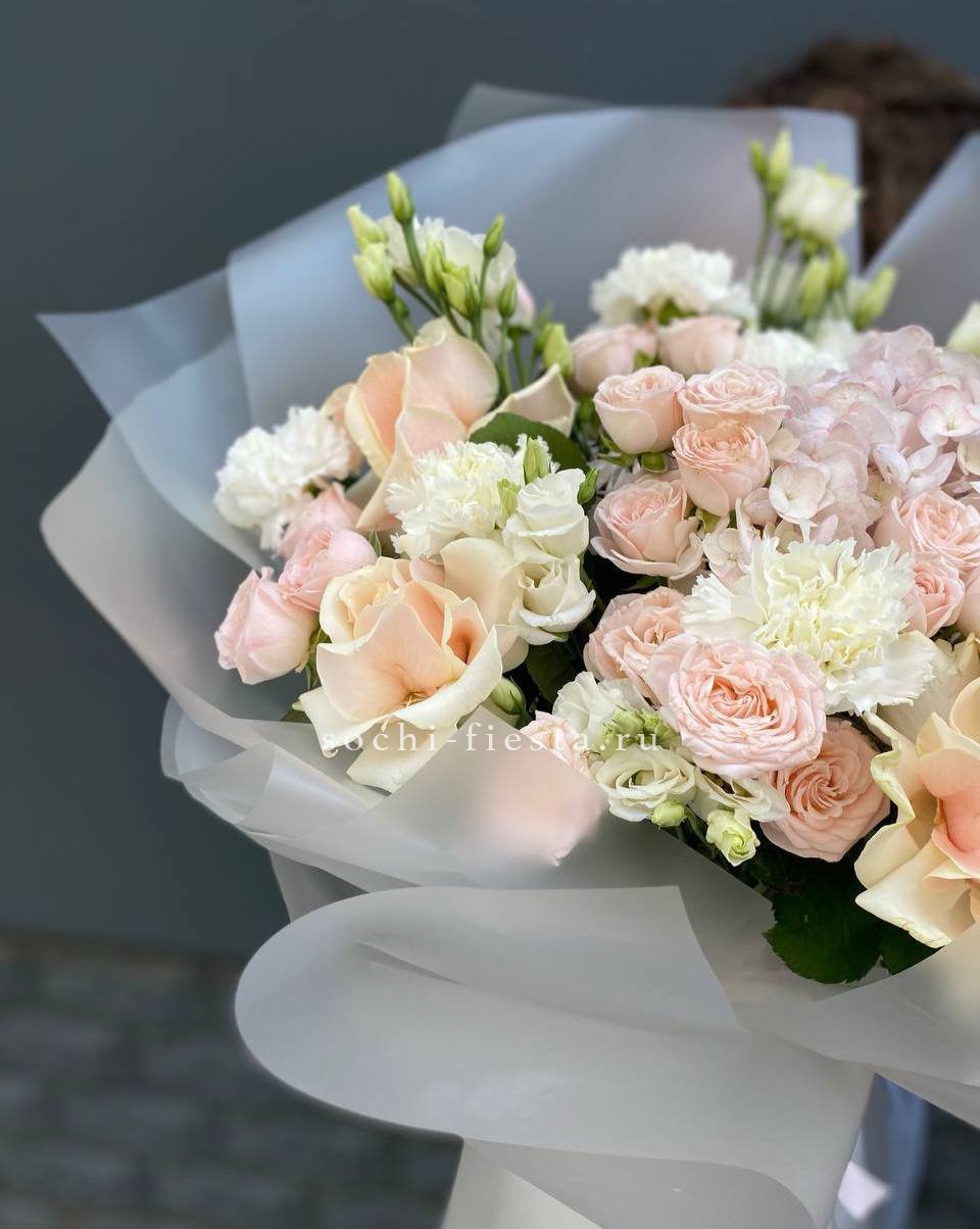 гортензия, роза белая, диантус лента, дизайнерская пленка.