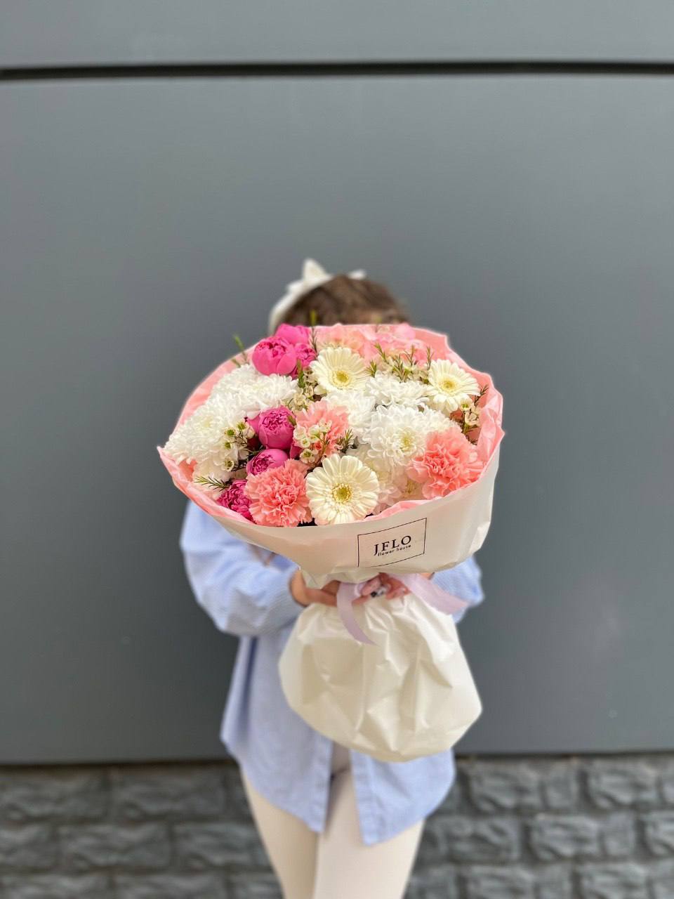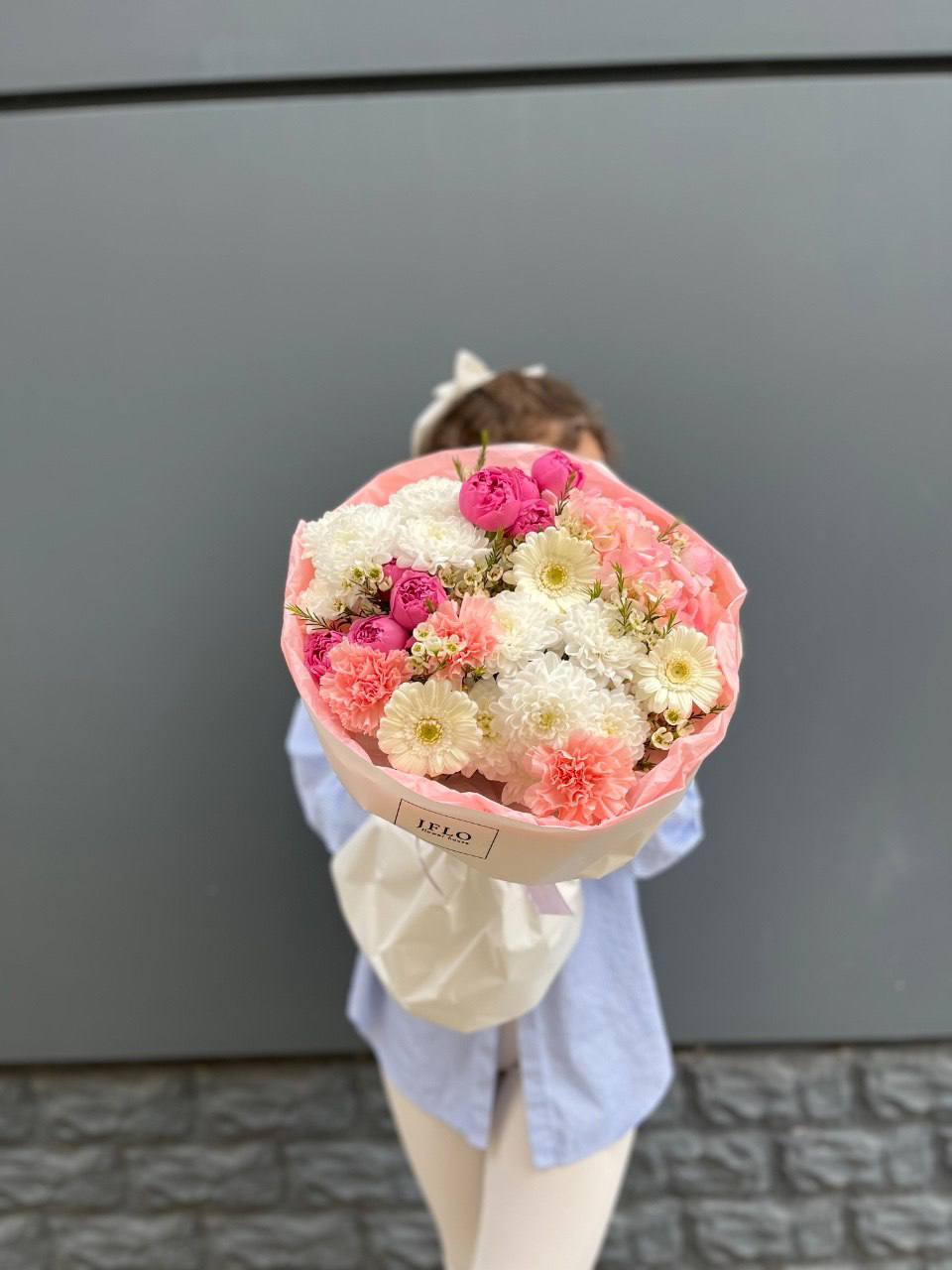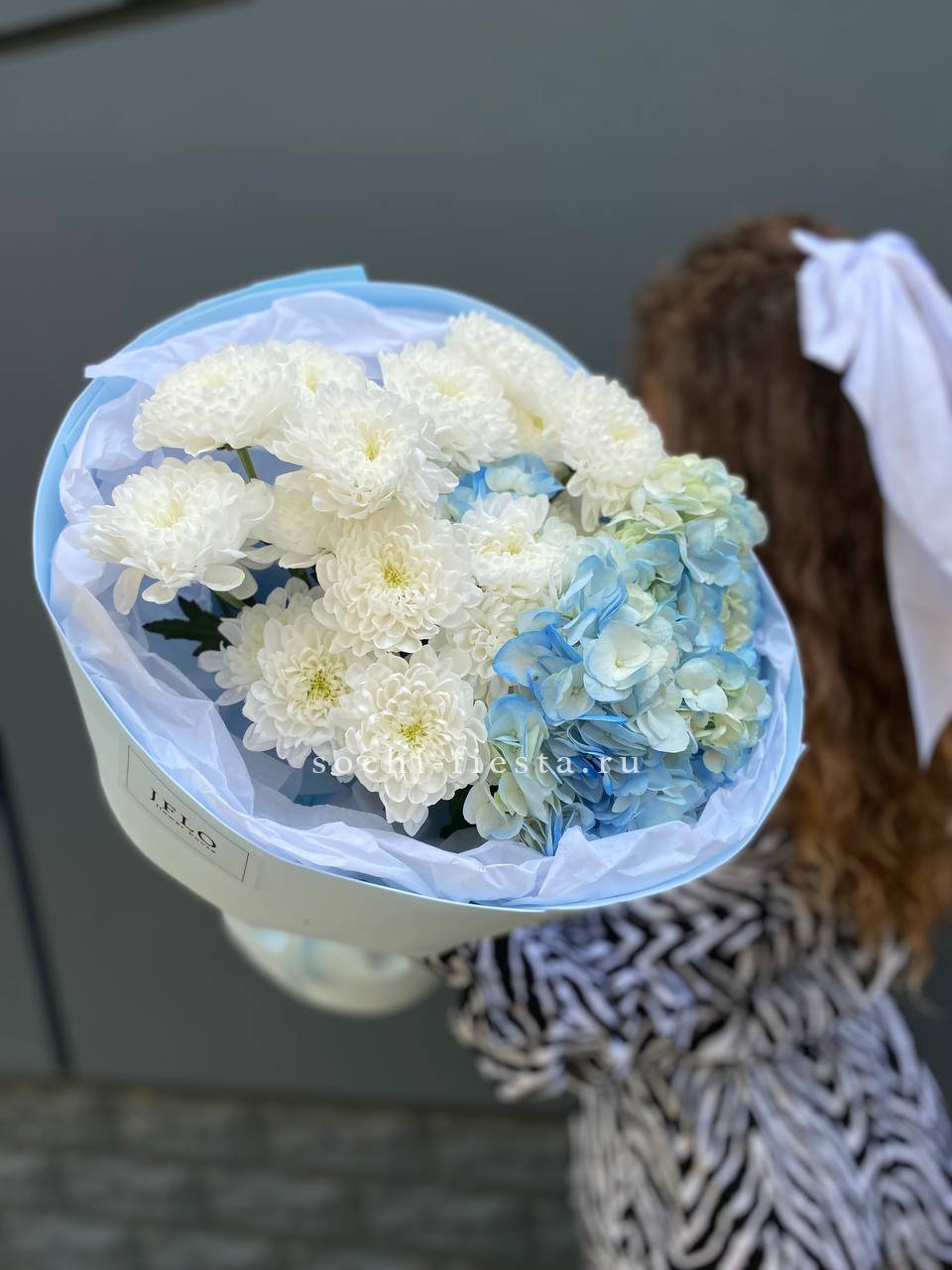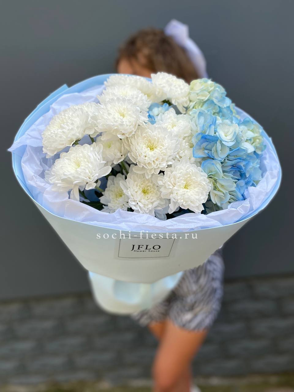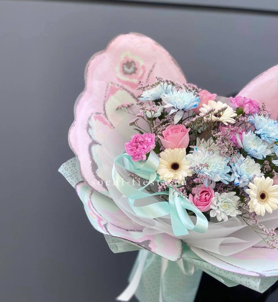 гортензия, хризантема, хамелациум, гербера, мисти баблс, диантус, пленка.