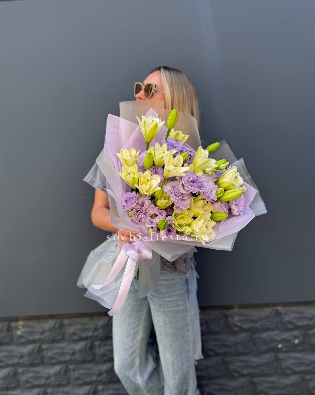 лилии, эустомы, дизайнерская упаковка.