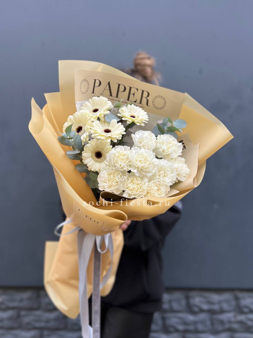 Яркие герберы и пышные диантусы создают лёгкую композицию с открытым силуэтом. Цветы словно парят в воздухе, а воздушная упаковка завершает образ без лишних деталей.