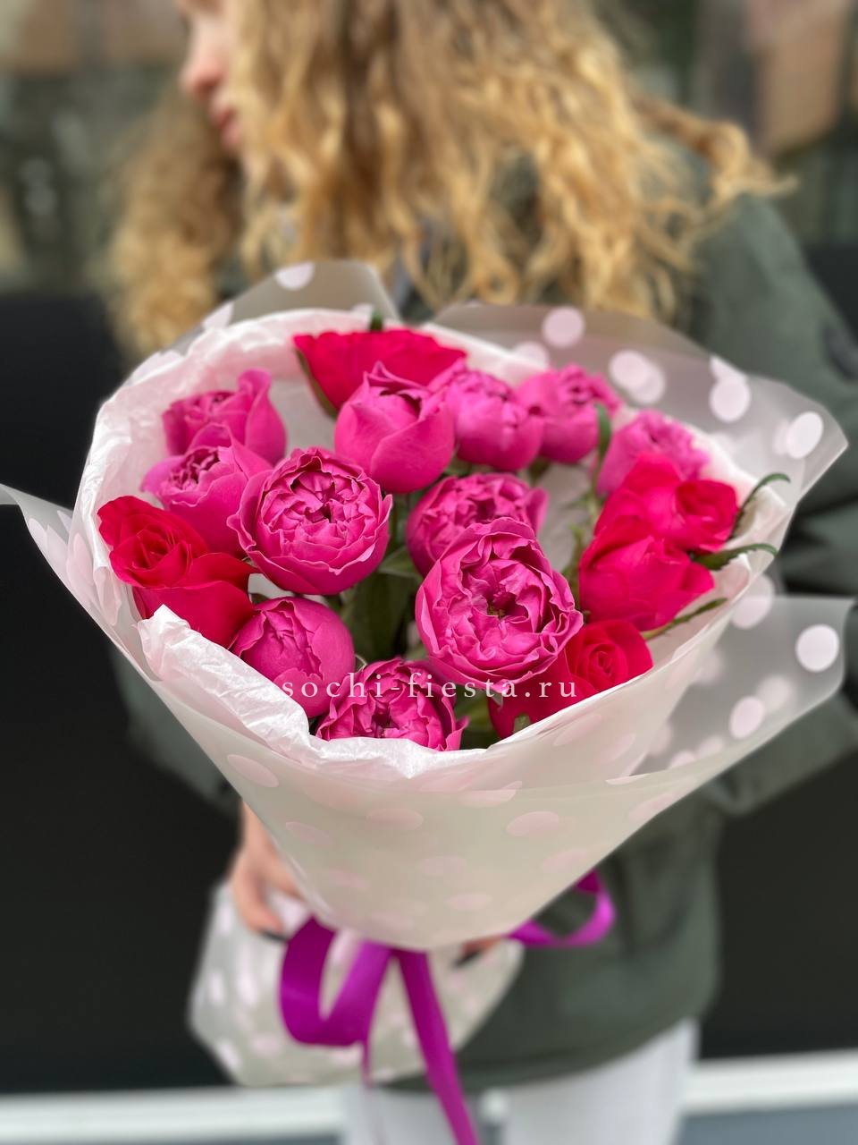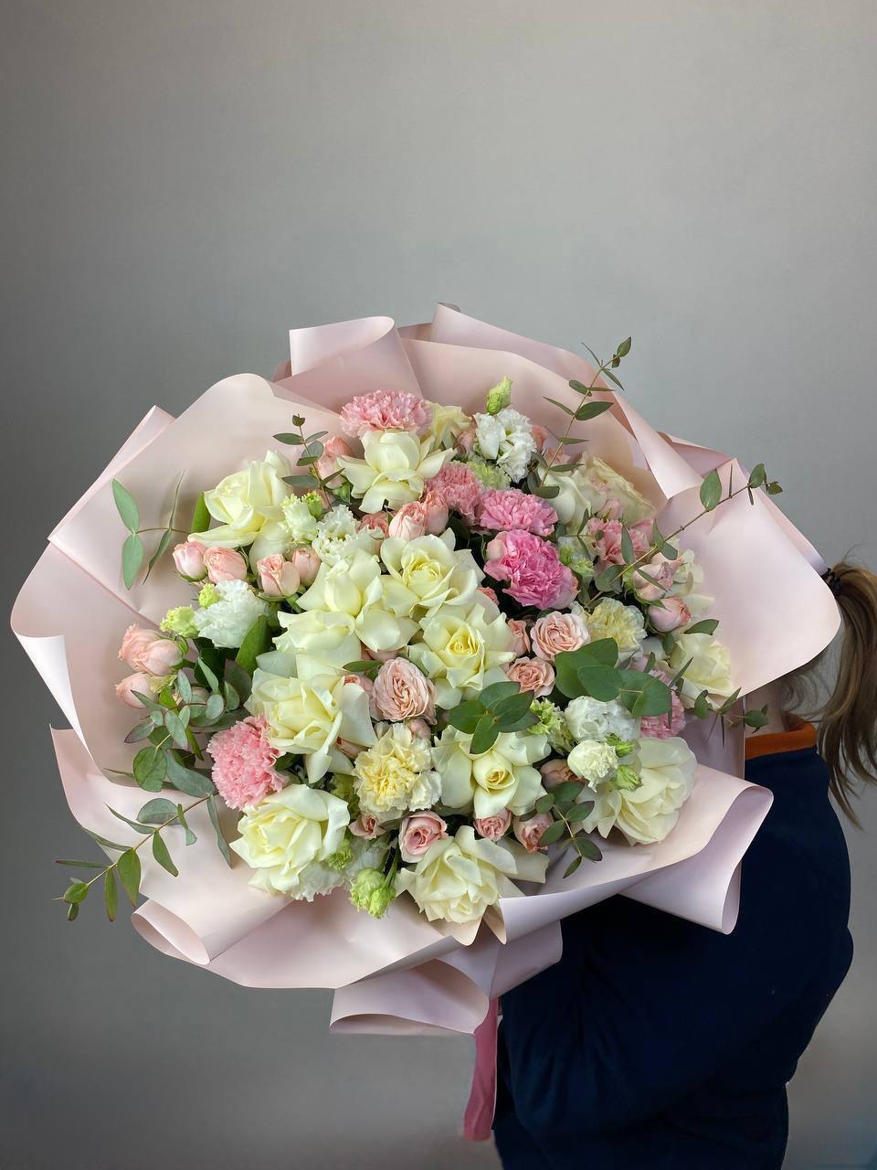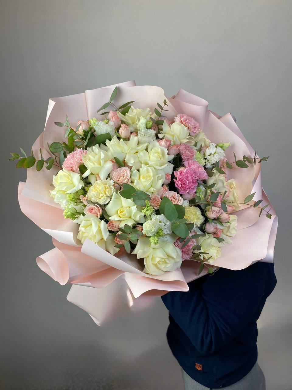 пионовидные розы, розовые пионы, диантусы, эвкалипт, лента, дизайнерская упаковка.