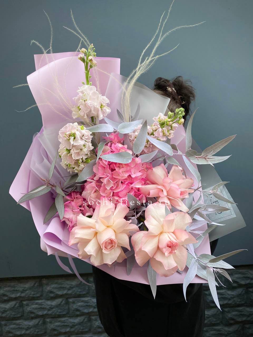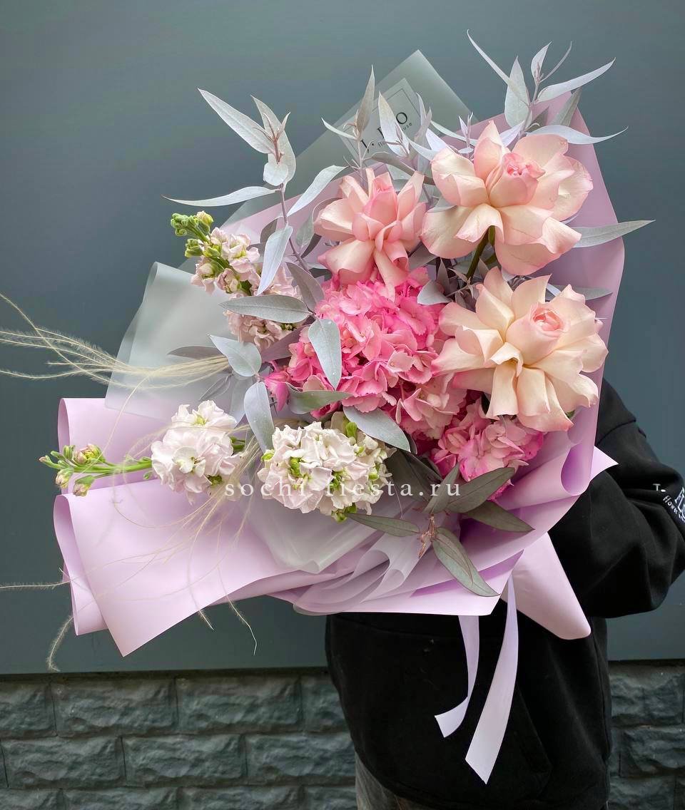гортензия, розовые пионы Сара Бернар, гипсофила (аналог вне сезона по согласованию) лента, дизайнерская упаковка.