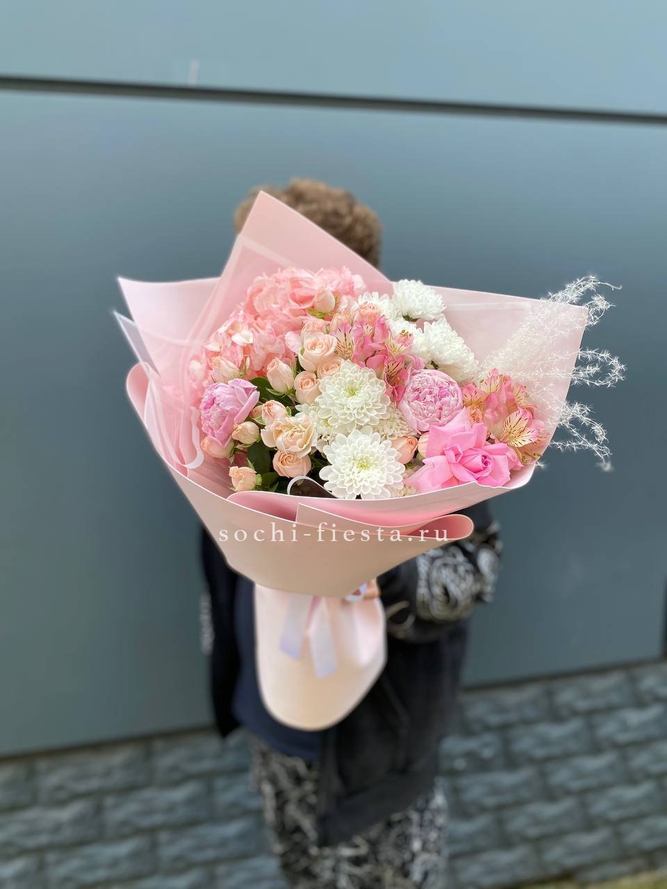 Пышные пионы и воздушные гортензии образуют объёмную композицию с живописной структурой. Кустовые розы и альстромерии добавляют букету плотности и заполняют пространство между крупными соцветиями.