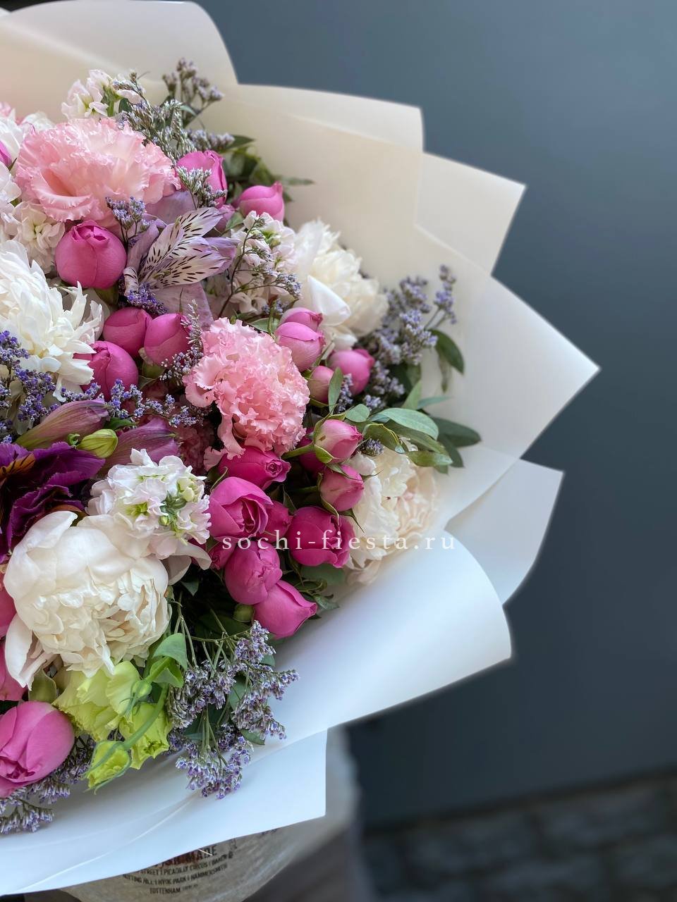 пионы (или аналог вне сезона), лимониум, маттиола, мисти баблс, эустома, эвкалипт, лента, упаковка.