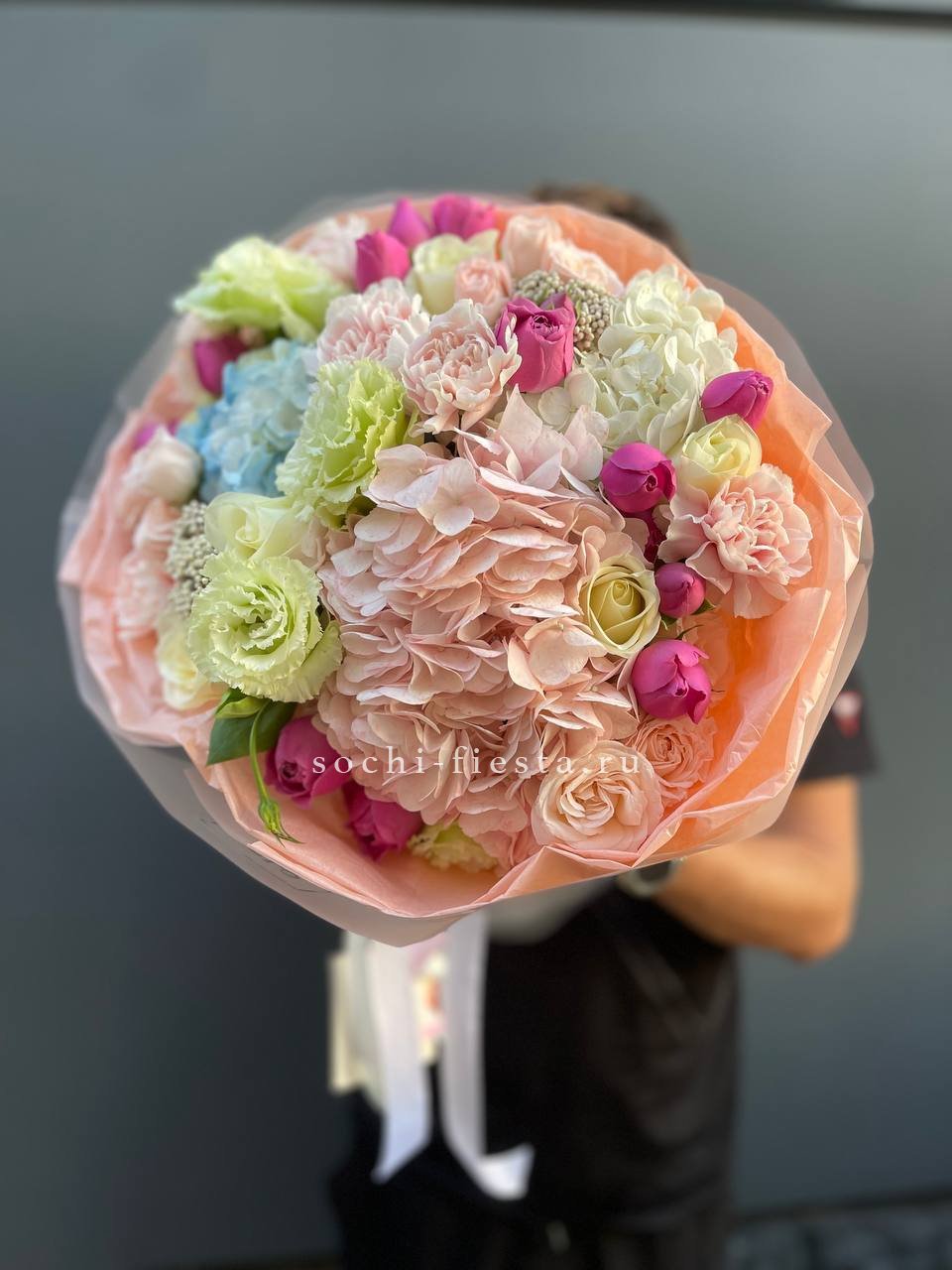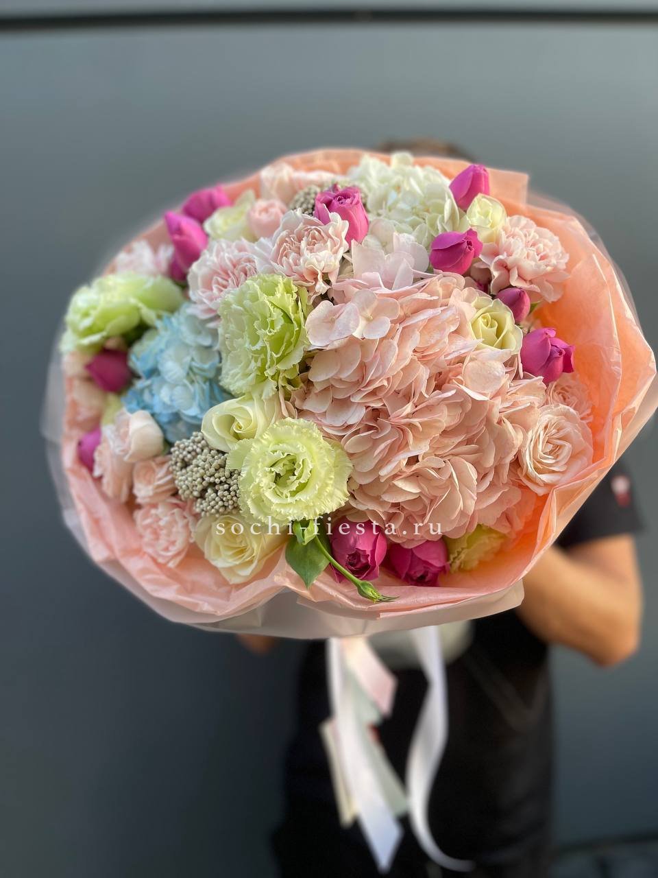 гортензия, роза одноголовая, бомбастик, декоративная зелень, эвкалипт, лента, дизайнерская упаковка.