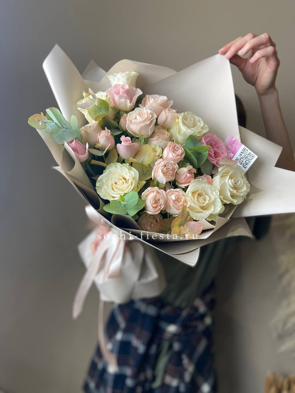 Весенняя встреча сирени и пионовидных кустовых роз в лёгкой упаковке. Ароматный дуэт для тех, кто ценит естественность и простоту.