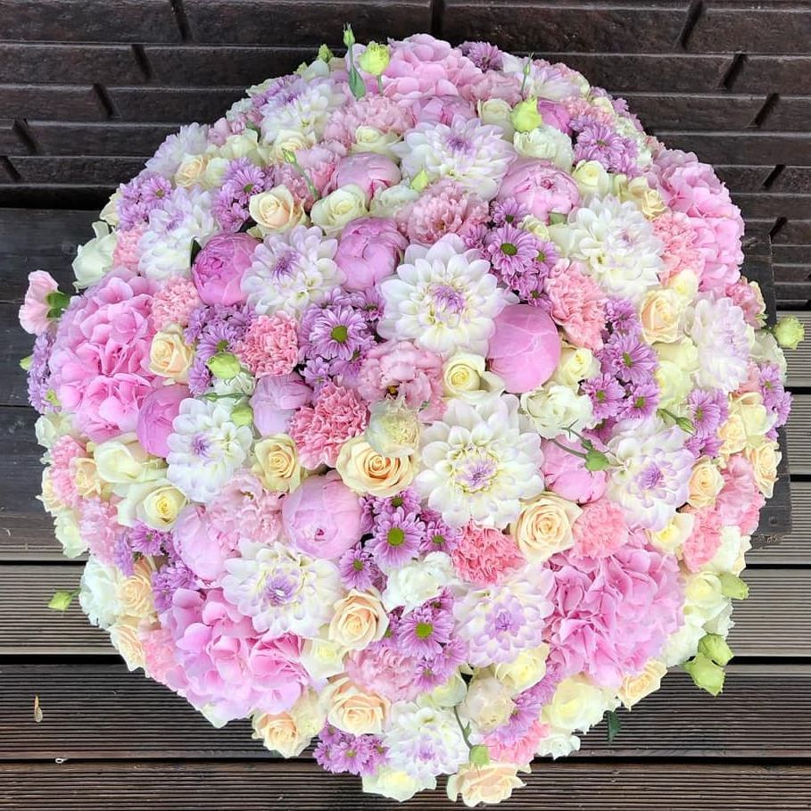 гортензия, розы, диантусы, хризантема, пионы (или пионовидные розы), эустома, корзина. Состав может меняться, в зависимости от сезона.