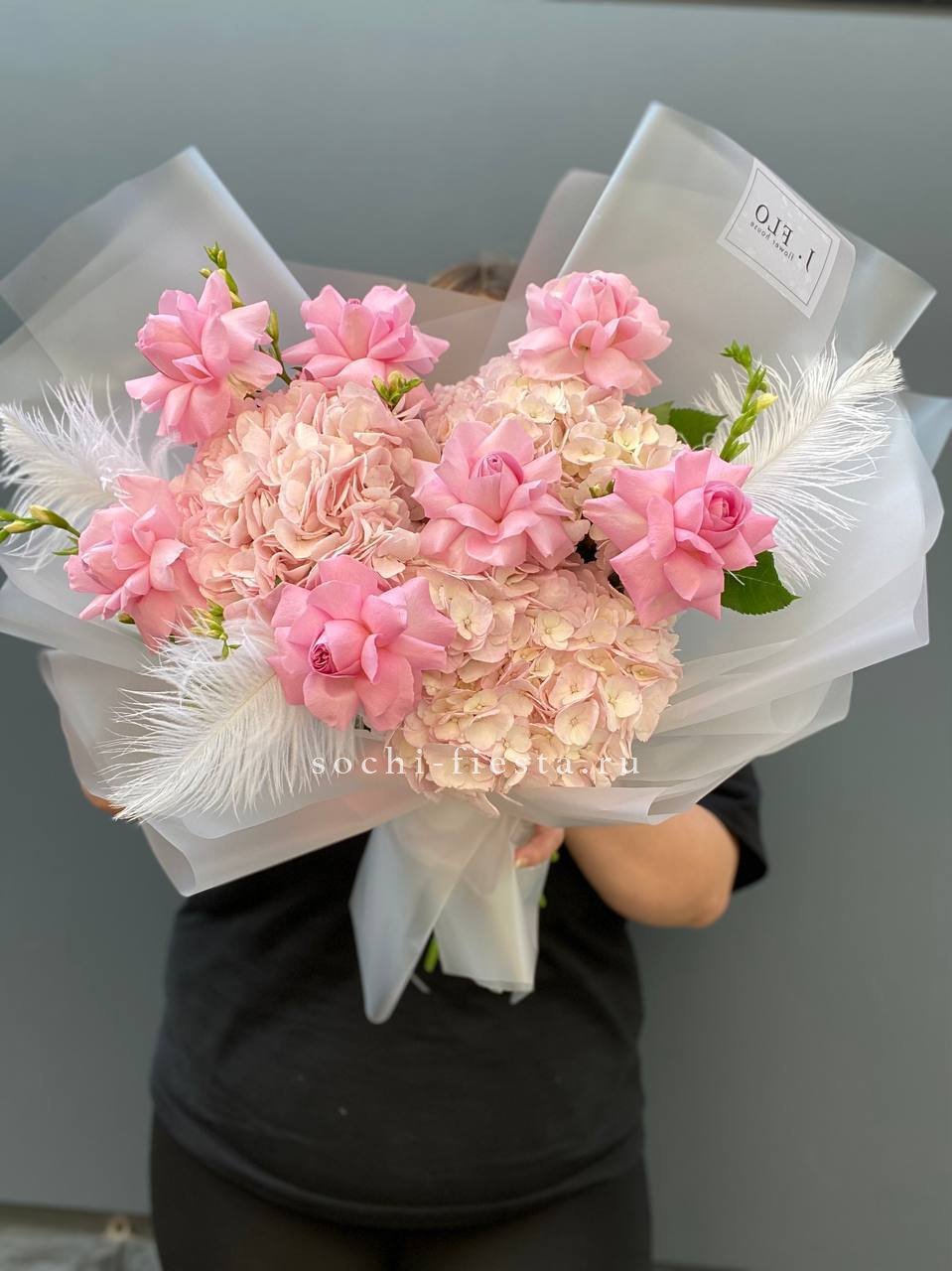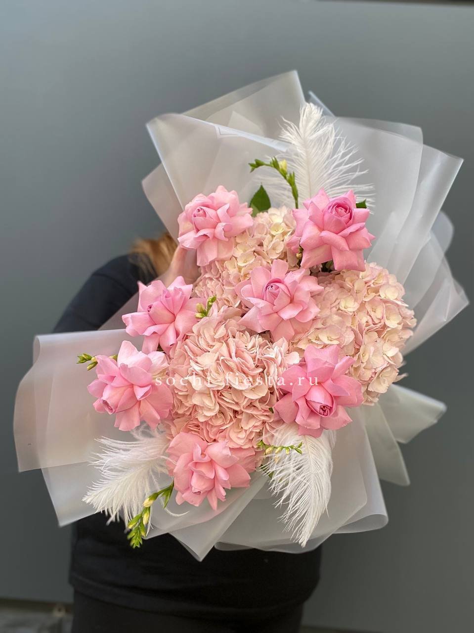 розовые розы, белые розы, диантус, бомбастик, гортензия, эвкалипт, пленка.