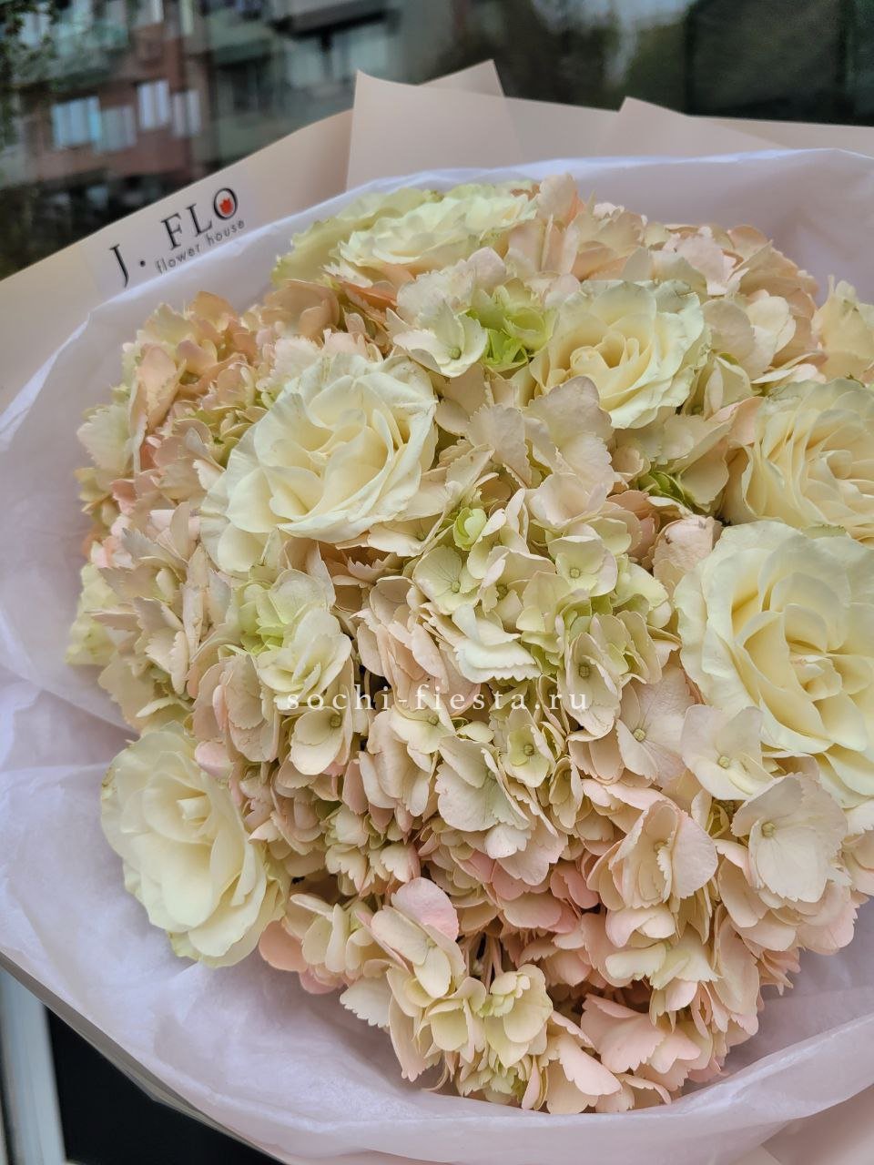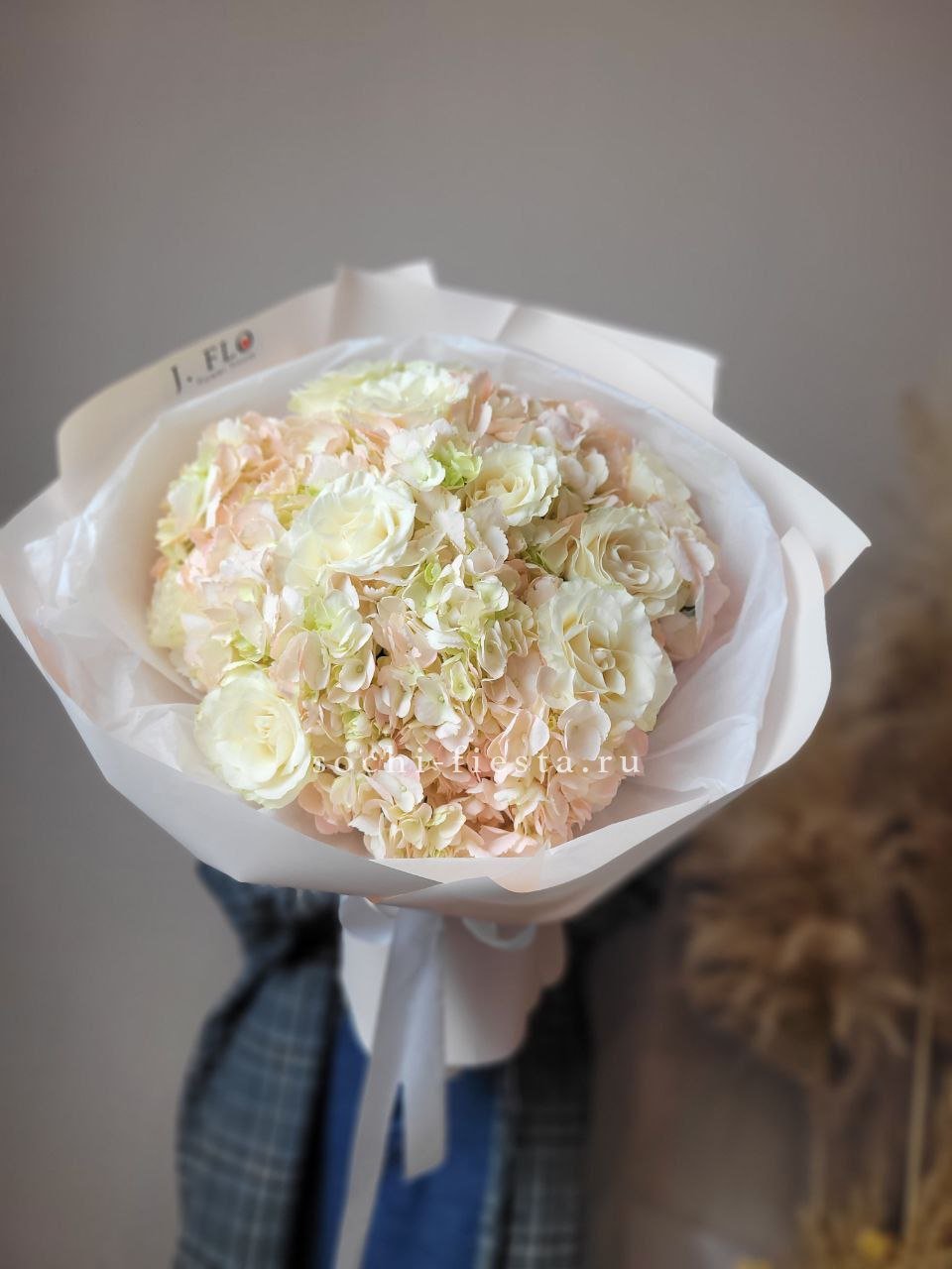 гортензия, эустома, кустовые розы, одноголовые розы, эвкалипт, вспомогательная зелень.